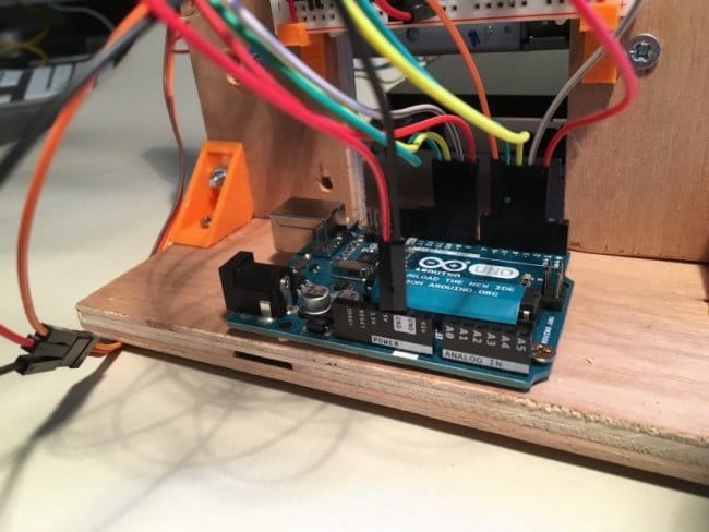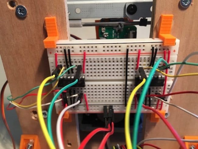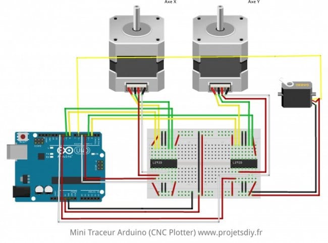 Meistras bandė naudoti lengvai prieinamas ir pigias medžiagas. Norėdami valdyti X ir Y ašių žingsninius variklius, yra dvi galimybės. Arba naudodamiesi dviem L293D (po vieną kiekvienai ašiai), arba naudokite Motor Shield skirtą Arduino Uno.