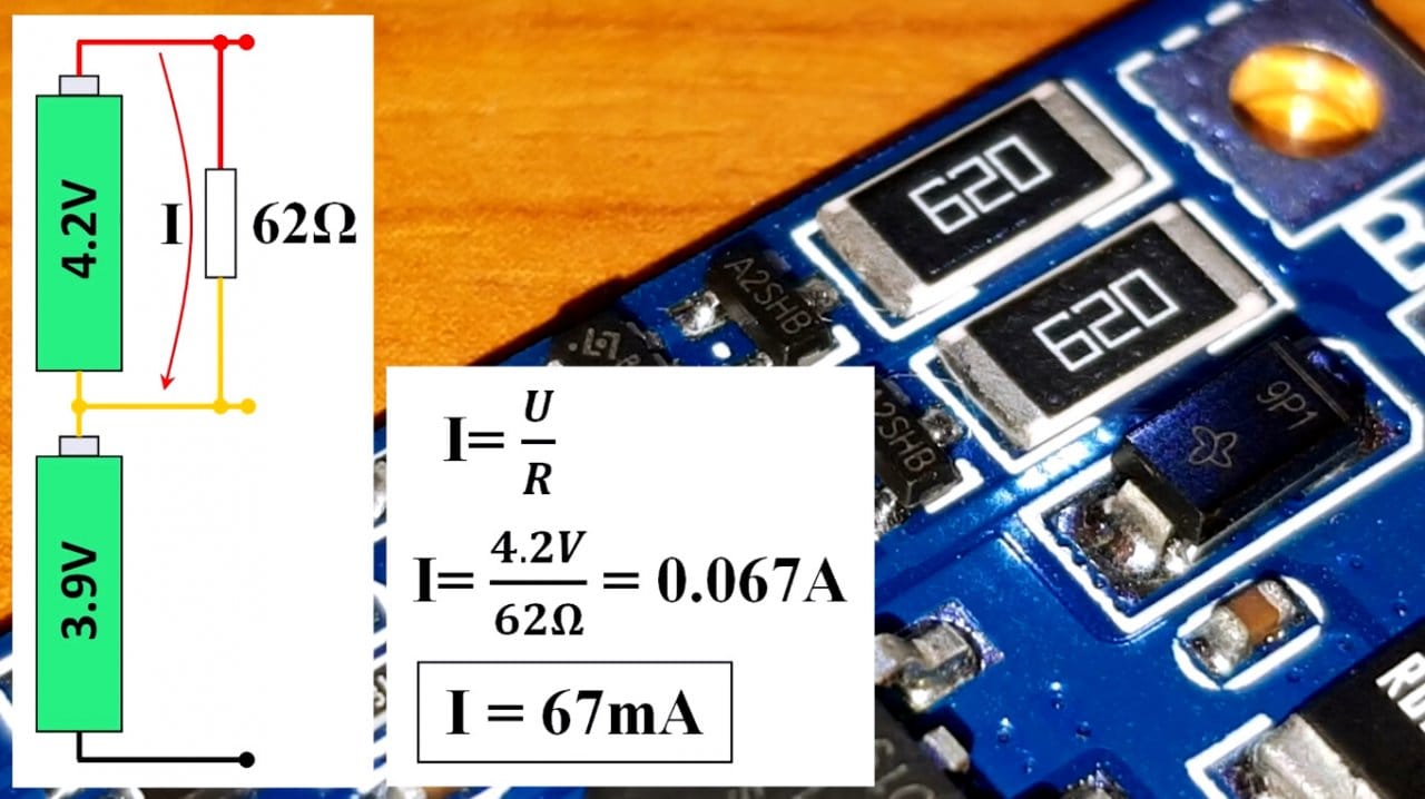 В итоге, по закону Ома, 4.2В/62Ом = балансировочный ток в 67 миллиампер.