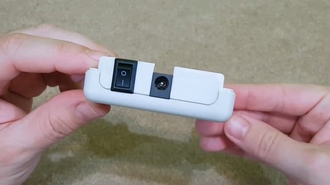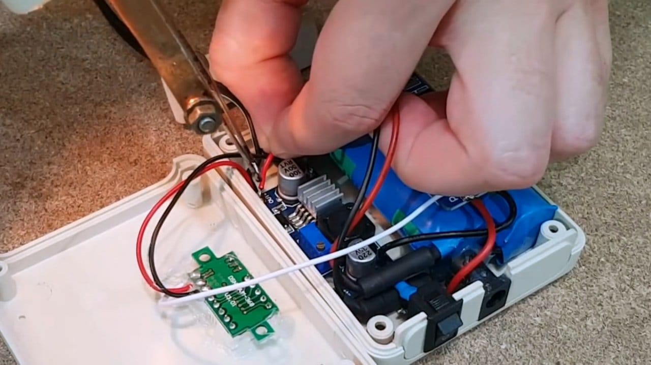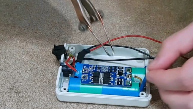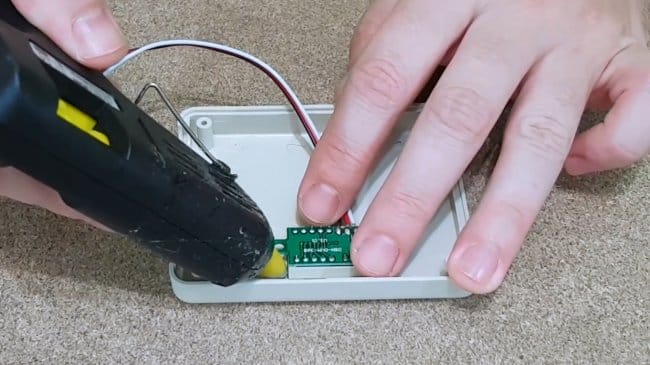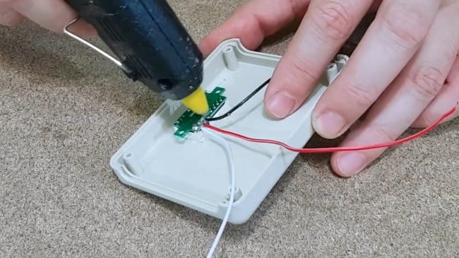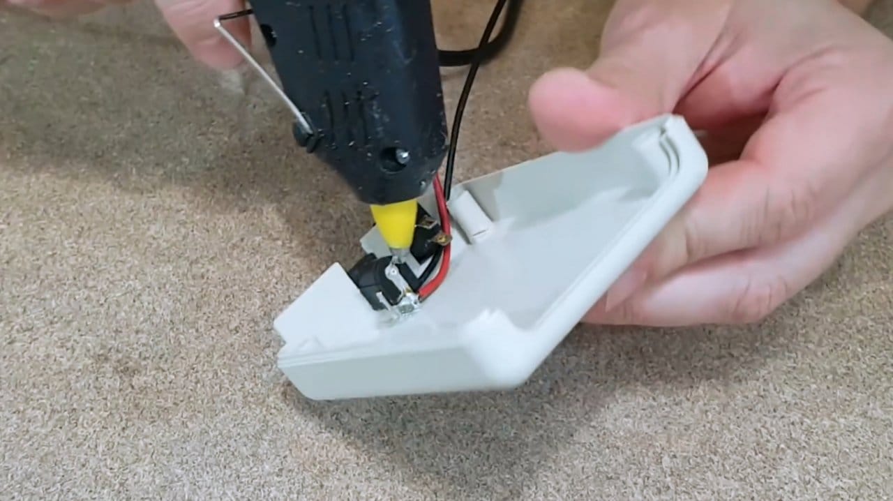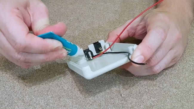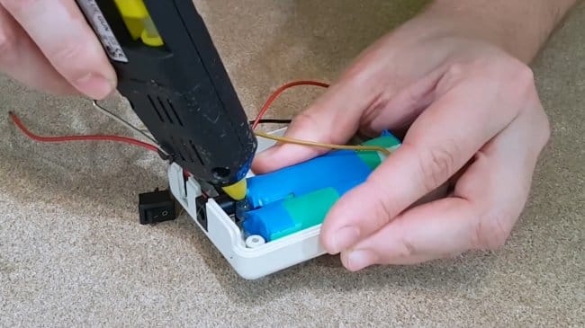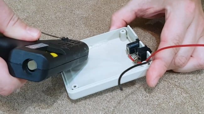 Припаяв провода к разъему питания и выключателю, автор изолирует клеммы горячим клеем.