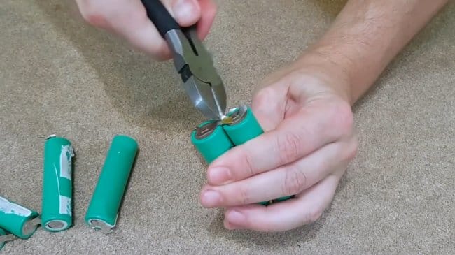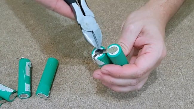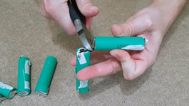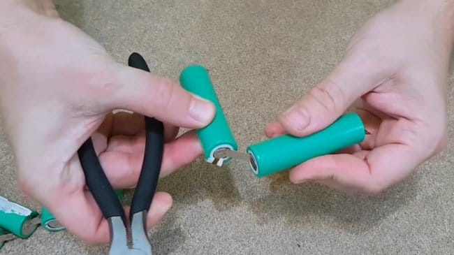 Автор рекомендует сначала перекусывать металлическую ленту, соединяющую отрицательные контакты батарей.