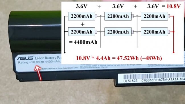 Исходя из данных, приведенных на наклейке ноутбучного аккумулятора, можно узнать емкость батареек и их рабочее напряжение. Общая емкость такого аккумулятора равна емкости одной ячейки.