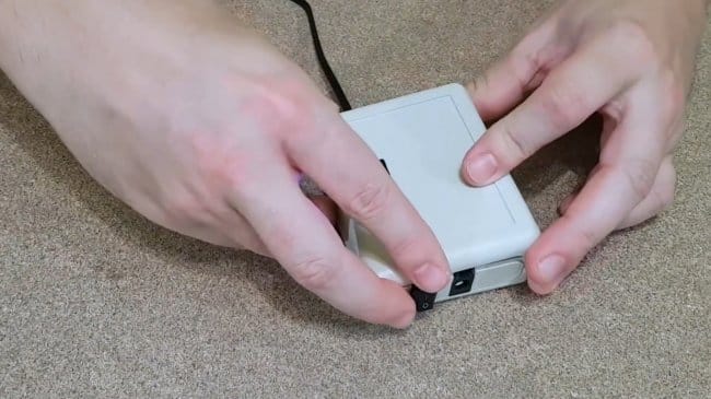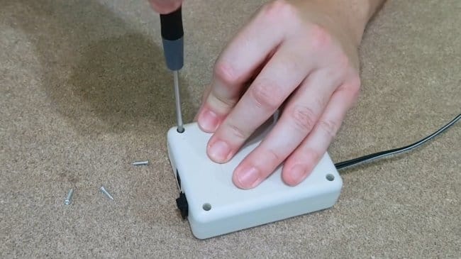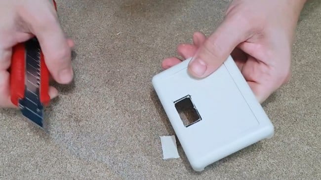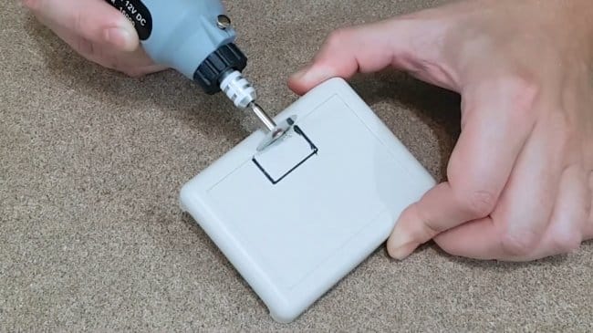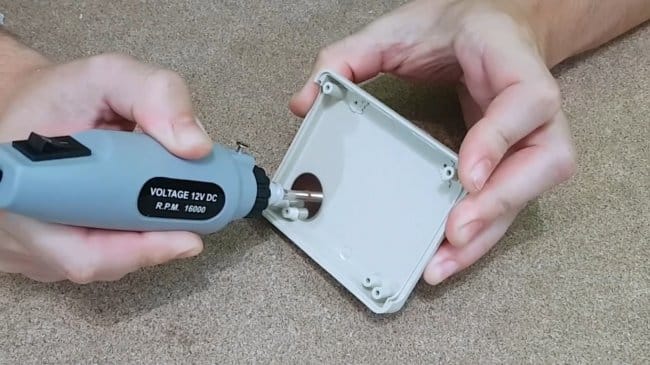 При помощи дремеля мастер срезает лишние крепления в корпусе, чтобы освободить место для компонентов, а также вырезает отверстия в боковой стенке для переключателя и разъема.