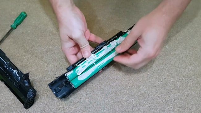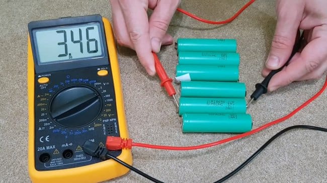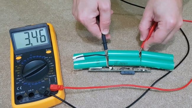 Разобрав корпус аккумулятора (в данном случае это схема 3s2p), автор производит замеры напряжение на ячейках мультиметром, находит дохлую. Напряжение на рабочих ячейках составляет 3,46В.