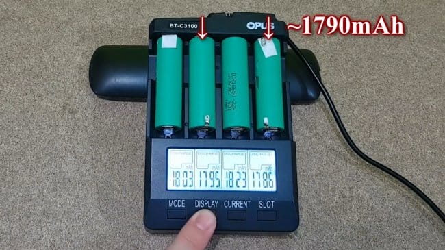 Чтобы проверить их в работе, и хорошенько зарядить, автор устанавливает кандидатов в автоматическое зарядное устройство, и делает три цикла разряд-заряд.