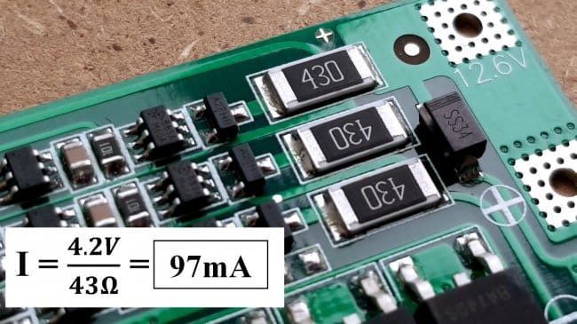 На плате BMS 3S уже резисторы на 43 Ом. Она имеет балансировочный ток 97 миллиампер, и может работать с ячейками большей емкости.