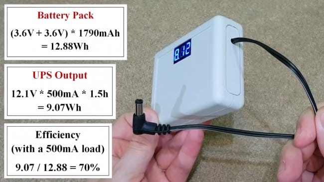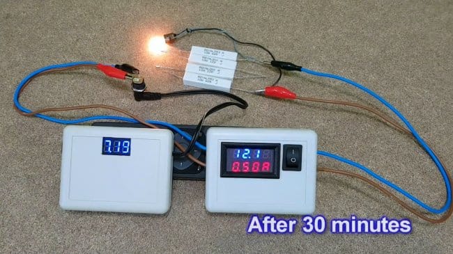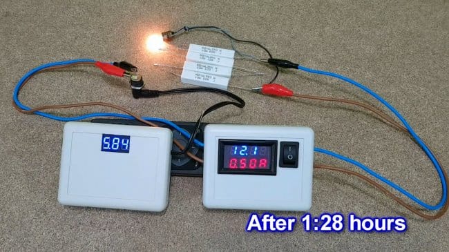 Если мы рассчитаем мощность исходя из емкости и напряжения аккумуляторной батареи, сравним ее с рассеянной на нагрузке, то КПД устройства — около 70%, что не так уж плохо.