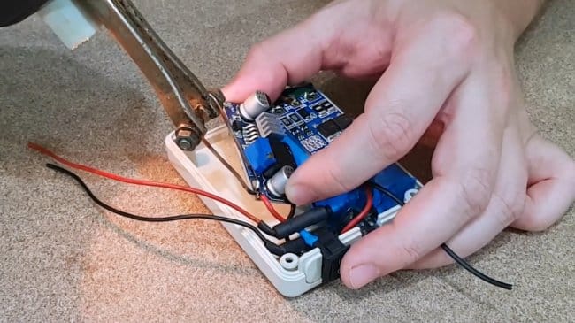Вращая потенциометр на повышающей плате, нужно установить выходное напряжение 12,1В. Небольшой запас делается для компенсации просадки.