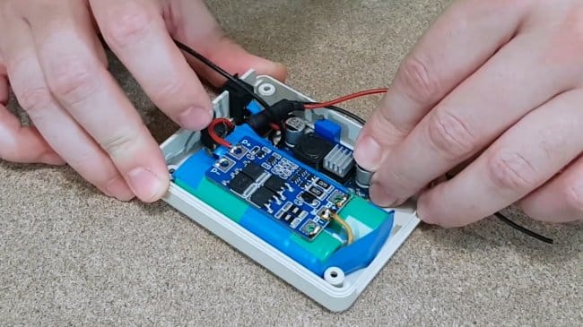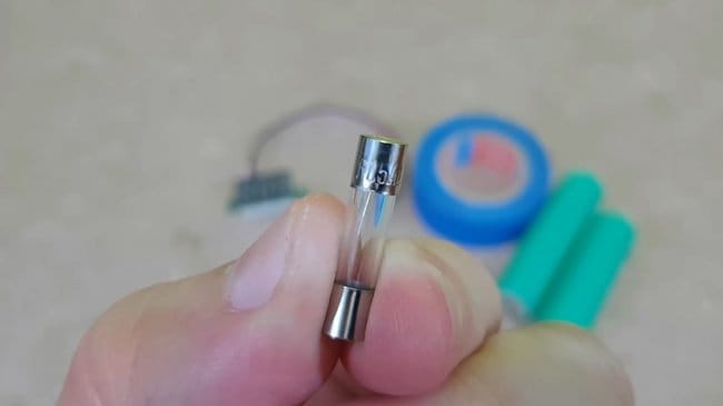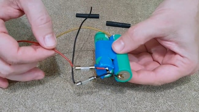 К положительному и отрицательному выводам ячейки 2S автор припаял провода, и установил по предохранителю на 1,5А — этого будет более чем достаточно для роутера.