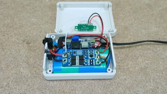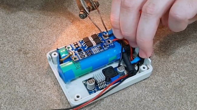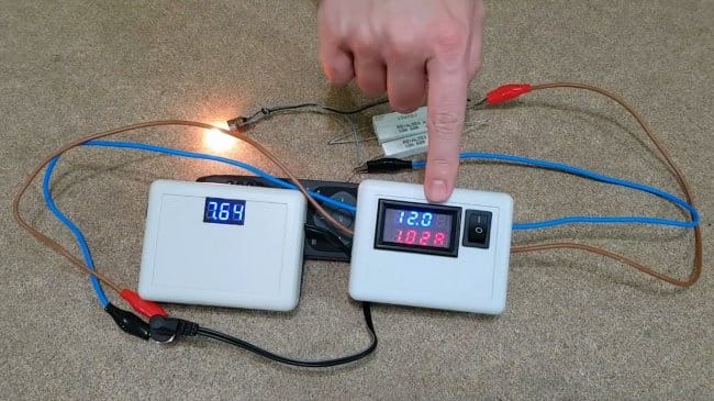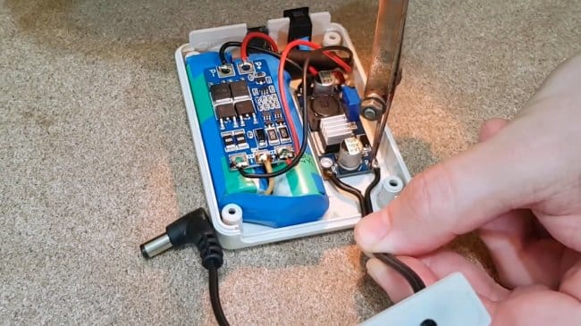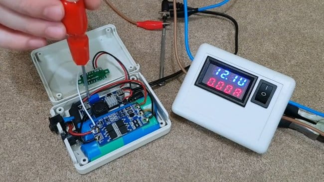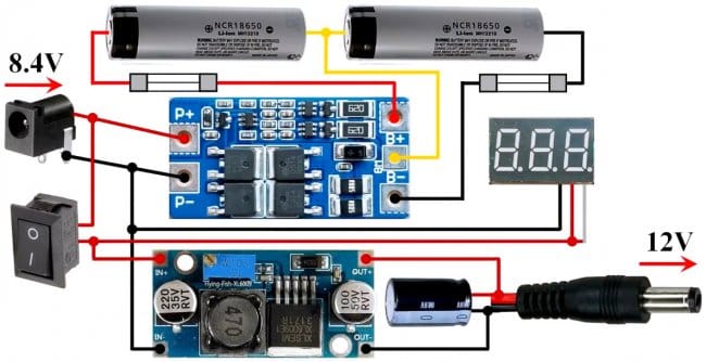 Для контроля напряжения на аккумуляторах, автор использует простенький вольтметр. В нем не будет необходимости, если Вы возьмете понижающую и повышающую платы с установленными вольтметрами.