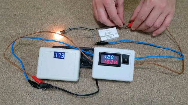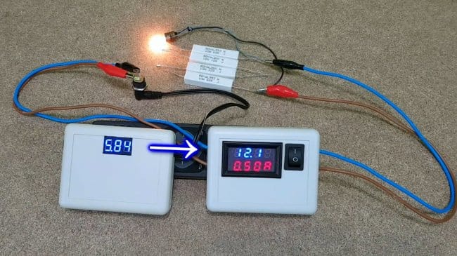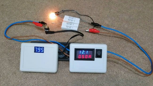 Автор подобрал нагрузку из резисторов и лампочки так, чтобы ток составил около 1А.