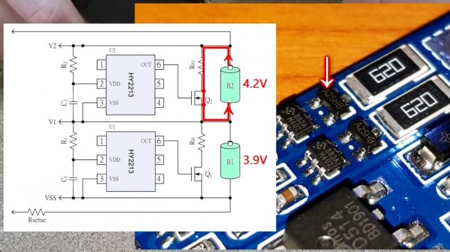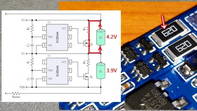 Когда один из литий-ионных элементов заряжается примерно до 4,2В, активируется транзистор и через этот резистор разряжается ячейка.