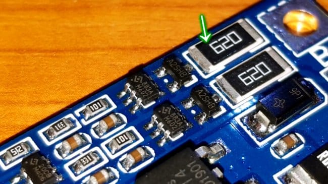 Таким образом, BMS будет поддерживать ее на уровне 4,2В до тех пор, пока другая ячейка не зарядится до того же уровня. Номинал балансировочных резисторов у этой платы BMS составляет 62 Ом.