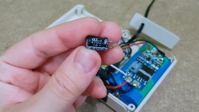 Также мастер припаивает параллельно выходу ИБП конденсатор емкостью 470мкФ, для фильтрации пульсаций.