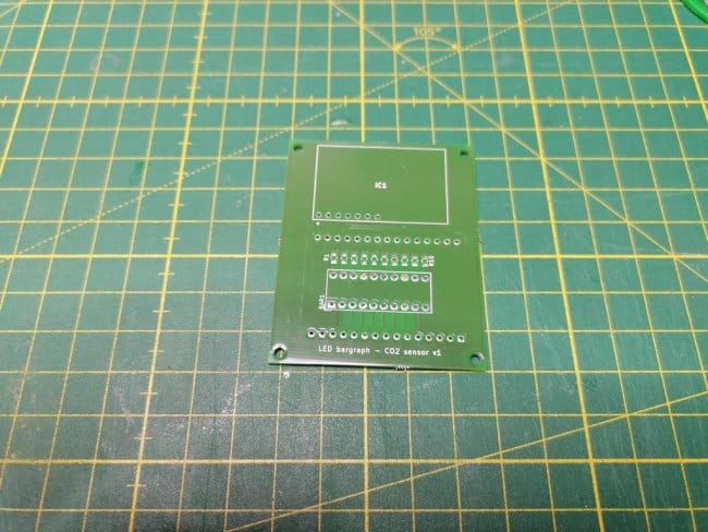 За исключением резисторов, все компоненты монтируются через отверстия. Светодиодный модуль должен быть размещен спереди так, чтобы обозначение модели сбоку было обращено вниз. ESP32 и SCD30 устанавливаются сзади. Для SCD30 рекомендуется оставлять небольшое расстояние между датчиком и платой, которое может быть достигнуто установкой монеты между датчиком и печатной платой в качестве прокладки перед пайкой.